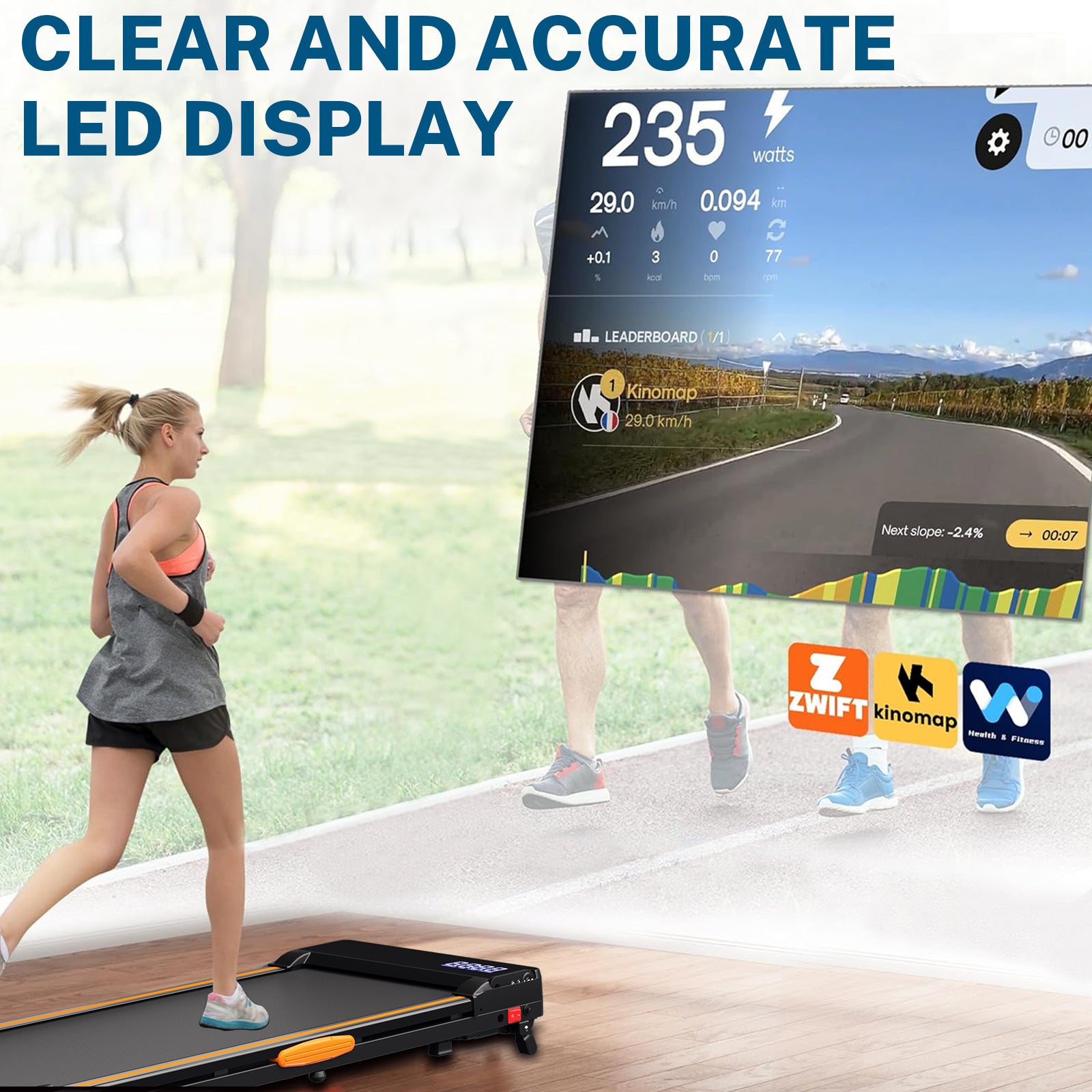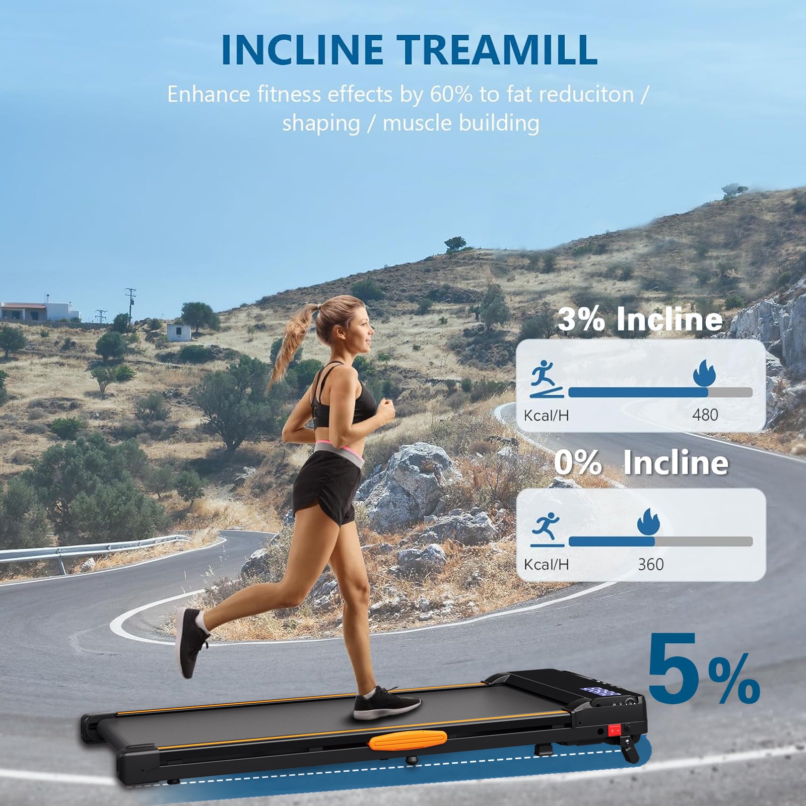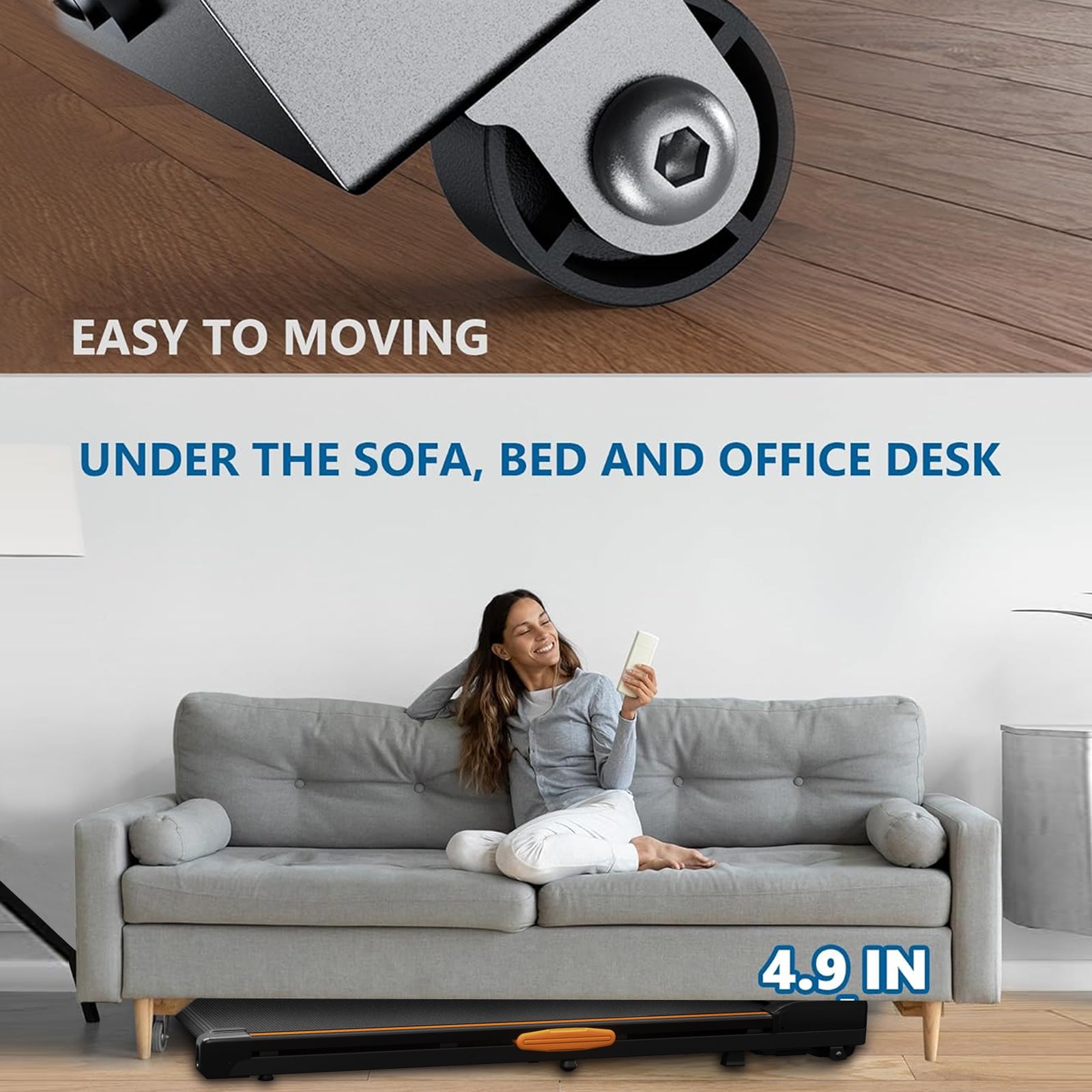 - Compact Treadmill for Easy Movement---The compact under desk treadmill is just 4.5 inches thick even with incline function, it is still very thin and light. The treadmill has two front wheels, allowing you to easily move and place it under a desk, bed, or sofa. Our under-desk treadmill requires no installation and is ready to use right out of the box.