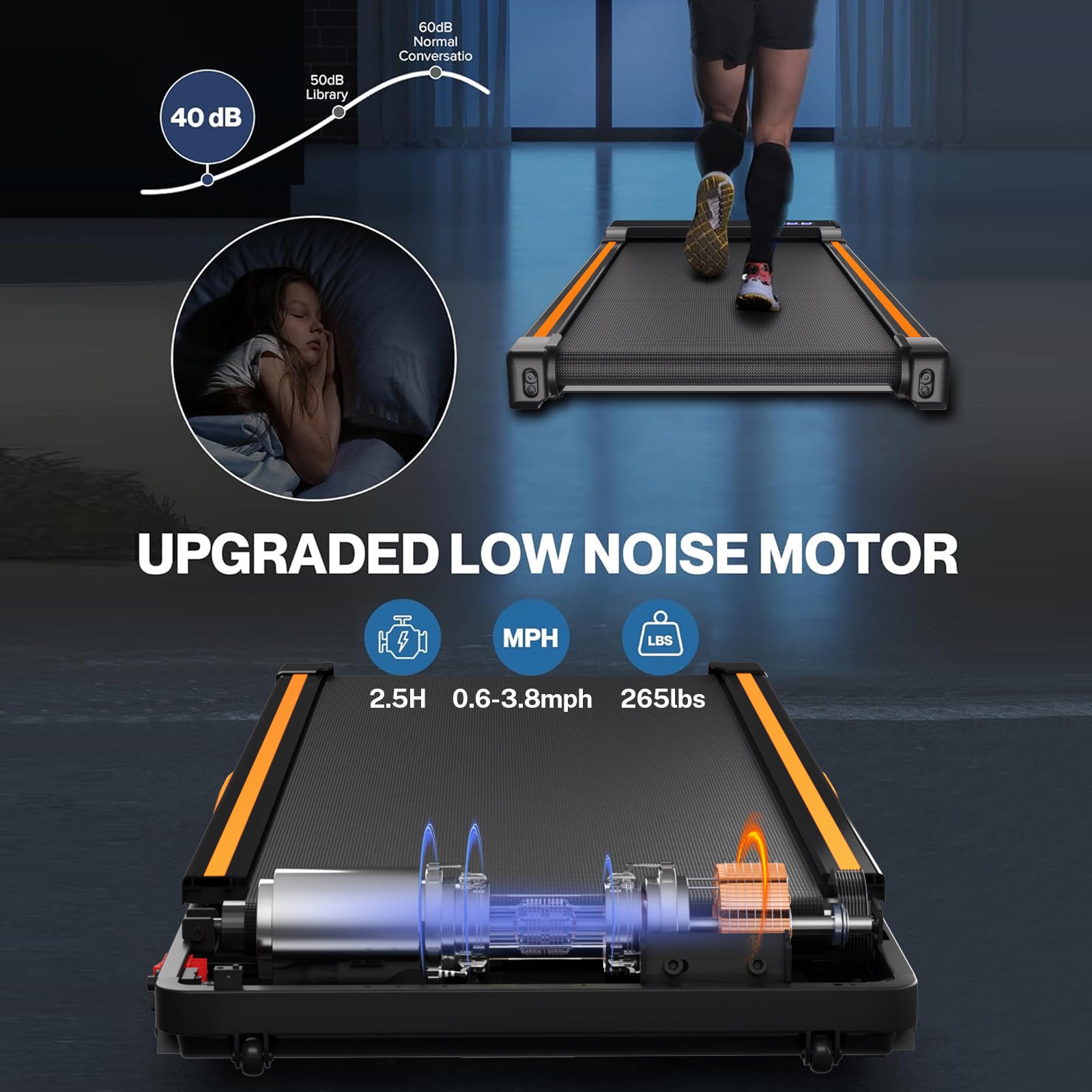 - 2.5HP Powerful Silent Motor---Walking treadmill is equipped with a 2.5HP motor that can support weights up to 265 pounds while keeping operating noise level lower than 45 db, making it ideal for home and office use without worrying about disturbing others. Enjoy a quiet and comfortable workout experience with an under desk treadmill.