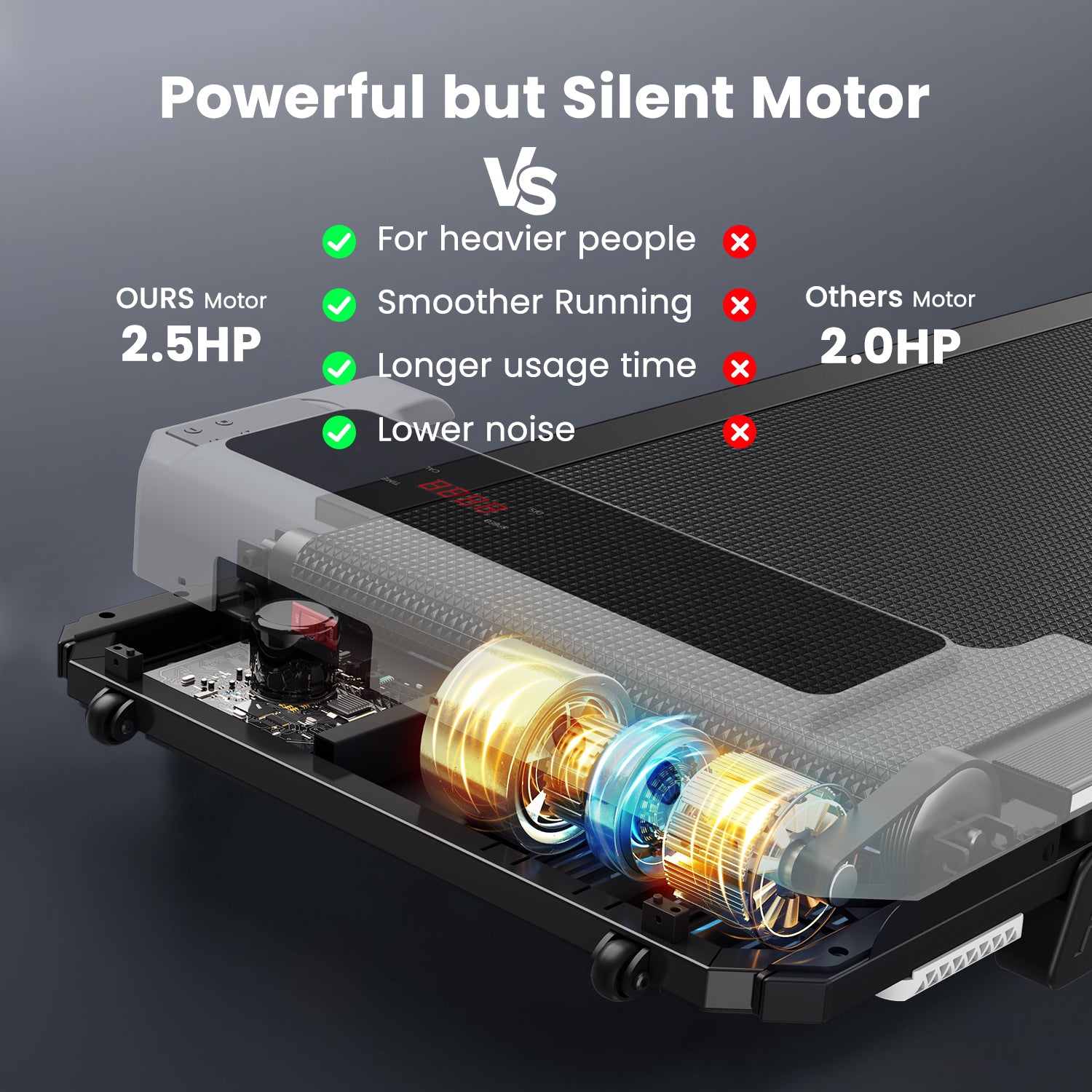 2.5HP Powerful Silent Motor---Walking treadmill is equipped with a 2.5HP motor that can support weights up to 265 pounds while keeping operating noise level lower than 45 db, making it ideal for home and office use without worrying about disturbing others. Enjoy a quiet and comfortable workout experience with an under desk treadmill.