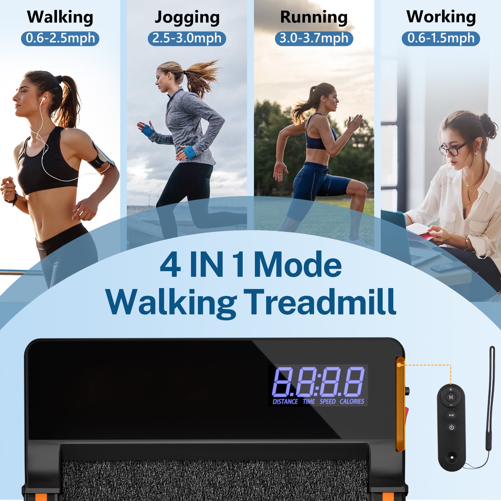 - Target Setting & Tracking Fitness Data---This portable treadmill with LED display allows you to accurately track speed, distance, time and calories in real time. Also you can set time, distance, and calorie goals. After completing the corresponding goals, the treadmill will stop. The remote control makes it easy to adjust the speed and stop the machine while running. This walking treadmill offers speed levels from 0.6 to 3.8 MPH, allowing you to choose different speeds based on your needs.
