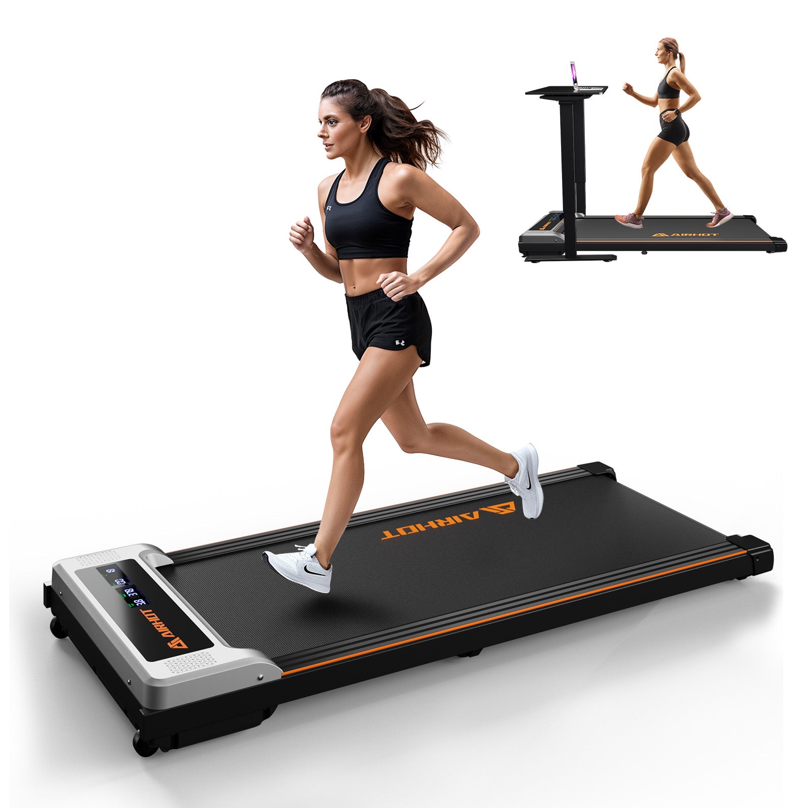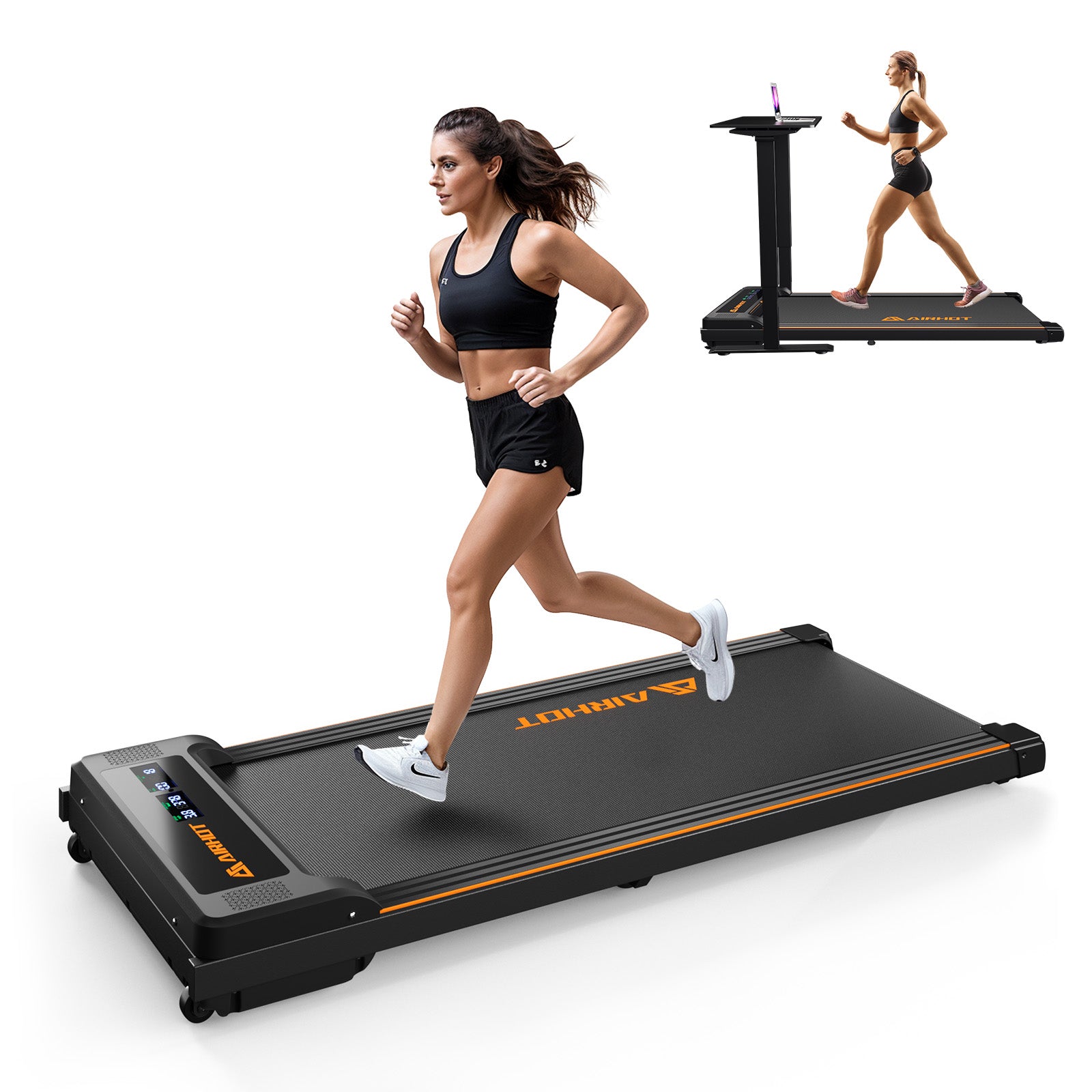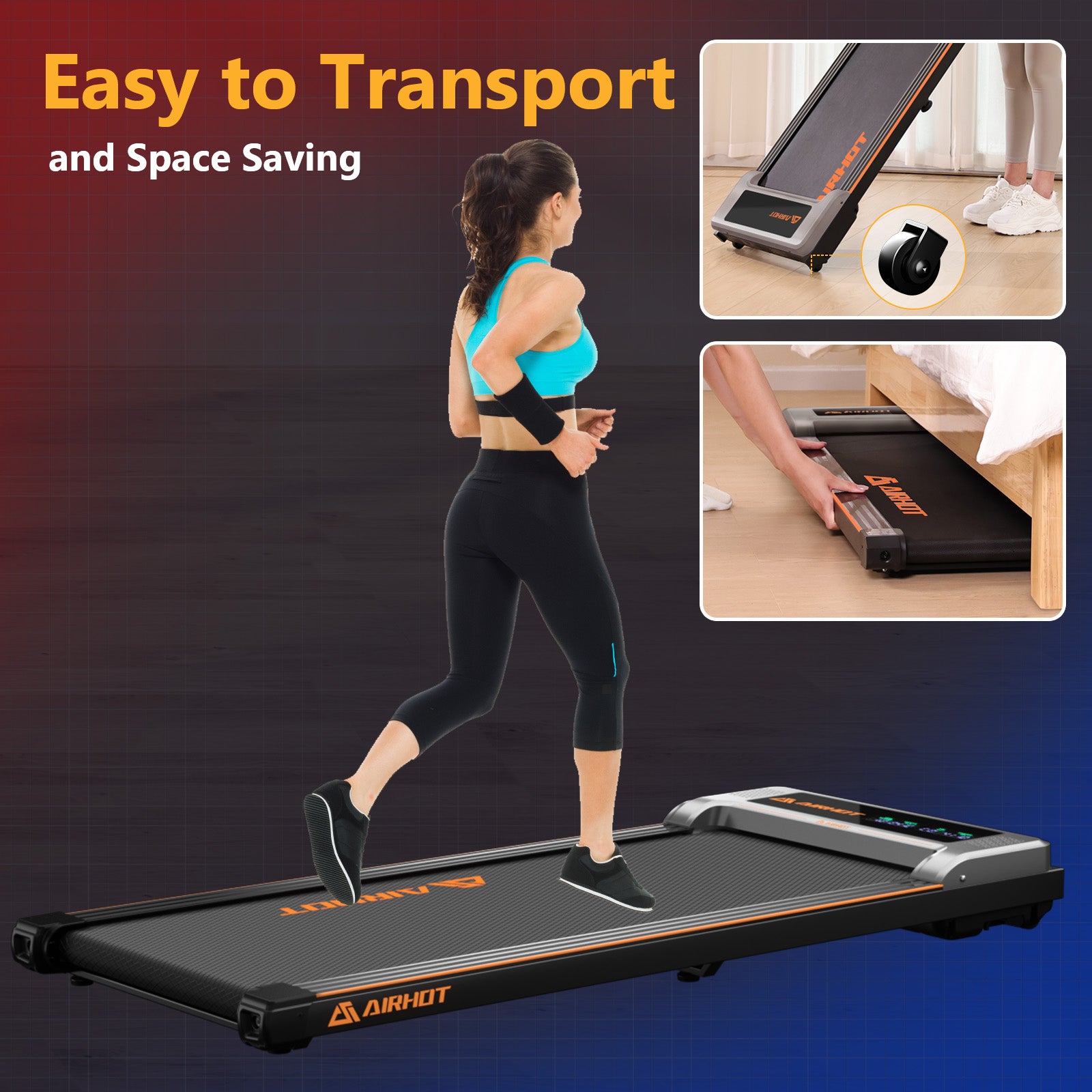 【Compact & Convenient】Measuring just 4.9 inches thick, the AIRHOT Portable treadmill is compact and easy to store. It comes with built-in wheels, allowing you to effortlessly move and place it under your desk, bed, or sofa. Perfect for those with limited space, this treadmill seamlessly fits into any environment without compromising on functionality.